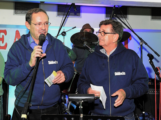 Ein bisschen Traditionspflege muss sein: Karl-Heinz Schwamborn und Klaus Berger vom Organisations-Team tragen zur Begrüßung der Gäste die Jacken, die sie 2010 von den SHAMROCKS nach deren Konzert in der OT geschenkt bekamen.